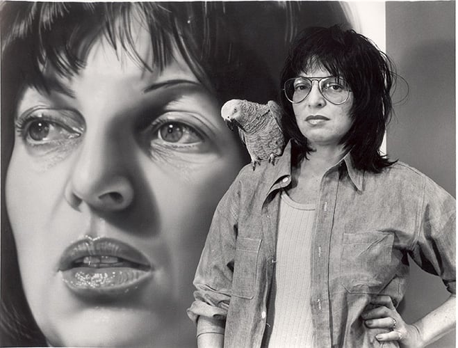Audrey Flack and parrot with Self Portrait (1974). Photo courtesy of Louis K. Meisel Gallery, New York.